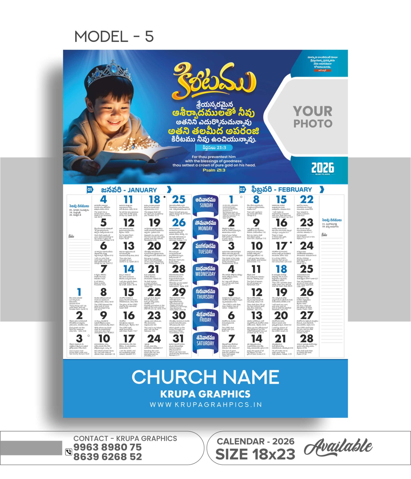 Krupa Graphics ,Secunderabad, is design various models of calendars. Specially design Christian Calendars for every Christmas and New Year. Here 5 models of calendars design like Model-1,2,3,4,5. You can choose best model and order now otherwise contact us.Click on below button for seeing models.